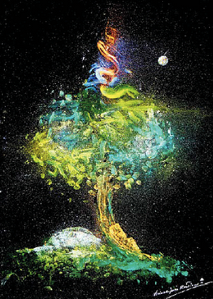 L’artiste reçoit des impulsions créatrices à travers les cellules d’un « corps conscient » forgé par un parcours de vie initiatique. L’artiste a développé une technique de création unique au monde en dessinant à mains nues sur des pigments. Ses matrices originales sont ensuite photographiées et travaillées chromatiquement afin d’être au plus près de la vibration de l’artiste au moment de l’acte créateur.